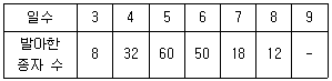 [과목 구분 없음] 발아율 검사를 위해 200개의 콩을 25°C 항온기에 두고 매일 발아한 종자 수를 관찰하여, 아래 표와 같은 결과를 얻었다. 발아율은?