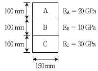 [과목 구분 없음] 그림과 같이 3가지 재료로 구성된 합성단면의 하단으로부터의 중립축의 위치[mm]는? (단, 각 재료는 완전히 접착되어있다) Pa
