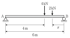 [과목 구분 없음] 그림과 같이 2개의 집중하중이 작용할 때, A 지점과 B 지점의 수직 반력이 같기 위한 x[m]는? (단, 보의 자중은 무시하고, 지점의 수직반력의 방향은 상향이다.)