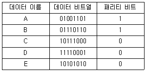 [과목 구분 없음] 네트워크에서 1비트의 패리티 비트(parity bit)를 사용하여 데이터의 전송 에러를 검출하려 한다. 1바이트 크기의 데이터 A, B, C, D, E 다섯 개를 전송하였다. 그 중 두 개의 데이터에서 1비트 에러가 발생하였고 나머지는 정상적으로 전송 되었다고 가정하자. 다음 표에서 에러가 발생한 두 개의 데이터는?