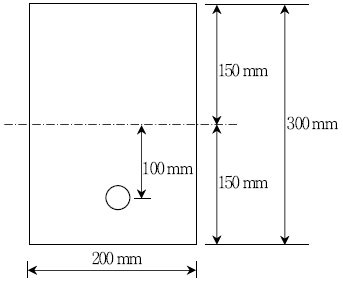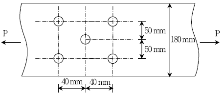 그림과 같이 t=5mm의 강판에 볼트구멍이 배치된 경우, 순단 면적[mm2]은? (단, 볼트공칭직경 ø=19mm이다)