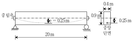 그림과 같이 긴장재를 포물선으로 배치한 프리스트레스트 콘크리트보를 하중평형의 개념으로 해석할 때, 긴장재를 긴장한 후 양끝을 콘크리트에 정착하면 압축력 외에 등분포의 상향력이 작용하게 된다. 이때 콘크리트보의 중앙단면에서 유효 프리스트레스 힘에 의해 발생하는 부(-)모멘트[kNㆍm]는? (단, 유효 프리스트레스 힘은 4,000 kN이다)