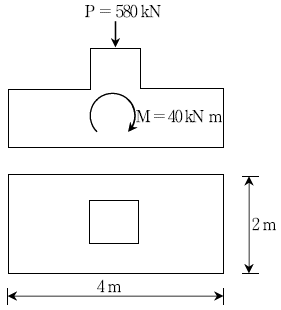 그림과 같이 바닥판과 기둥의 중심에 수직하중 P=580 kN과 모멘트 M=40kNㆍm가 작용하는 철근콘크리트 확대기초의 최대 지반반력[kN/m2]은?