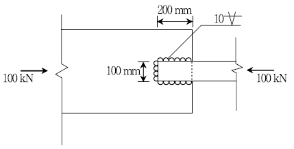 필렛용접 이음이 그림과 같은 경우 용접부에 발생하는 전단응력[MPa]은?