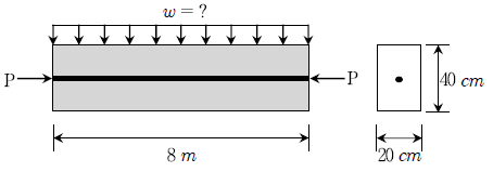 그림과 같이 지간이 8m인 프리스트레스트 콘크리트 단순보에 PS 강재가 직선으로 단면의 도심에 배치되어 있고 1,200kN의 프리스트레스 힘이 작용하고 있다. 보의 단위중량을 25kN/m3로 가정할 때, 보의 중앙단면 하연의 응력이 0(zero) 이 되도록 하기 위해 자중 외에 추가로 가해 주어야 하는 등분포하중 ω[kN/m]은?