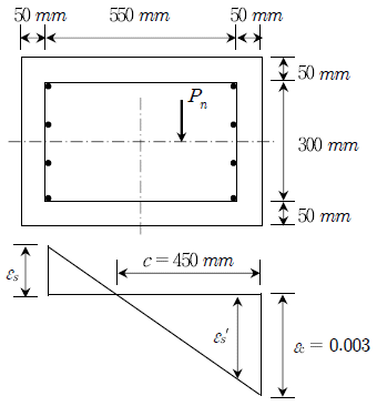 압축과 휨을 받는 띠철근 기둥(단주)이 그림과 같은 변형률 분포를 나타낼 때 도심으로부터 편심을 갖는 공칭 축하중강도 Pn[kN]는? (단,