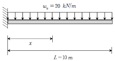 길이가10m인캔틸레버보에자중을포함한계수하중 ωu=20kN/m가 작용할 때 전단철근이 필요한 구간 x[m]는? (단, 최소전단철근 배근 구간은 제외한다. 그리고 폭 b=400mm, 유효깊이 d=600mm, fck=25MPa 이다)