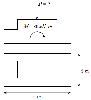 그림과 같이 콘크리트 기초판과 기둥의 중심에 수직하중과 모멘트가 작용하고 있다. 콘크리트 기초판과 기초 지반 사이에 인장응력이 작용하지 않도록 하기 위한 최소 수직하중[kN]은? (단, 자중에 의한 하중효과는 무시하고, 하중계수는 고려하지 않는다)