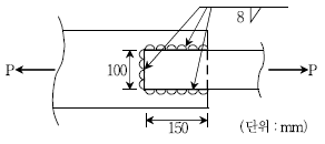 [과목 구분 없음] 그림과 같은 유효길이를 갖는 필릿용접부가 받을 수 있는 인장력 P[N]는? (단, 필릿용접의 허용전단응력 va=80MPa이다)