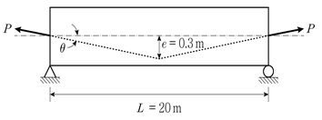 그림과 같은 프리스트레스트 콘크리트 단순보의 지간 중앙에서 프리스트레스 힘 P=3,000kN에 의한 상향력의 크기[kN]는? (단,