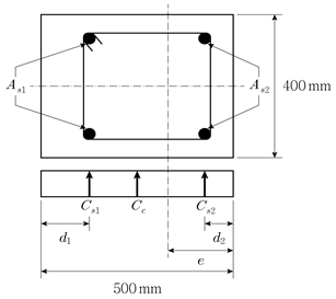 그림과 같이 순수 축하중을 받아 균등한 극한변형률이 발생한 콘크리트 기둥 단면에서 소성중심까지의 거리 e[mm]는? (단, 철근면적 As1에서의 압축력 Cs1=500kN, 철근면적 As2에서의 압축력 Cs2=500kN, 콘크리트의 압축력 Cc=4,000kN, d1=150mm, d2=50mm, 철근으로 인한 콘크리트의 단면 손실은 무시한다)