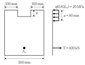 그림과 같이 철근콘크리트보 단면의 등가직사각형 응력블록과 철근 인장력의 크기가 주어졌을 때, 깊이 y[mm]는?