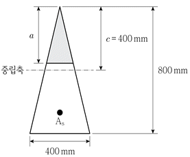 그림과 같은 삼각형 철근콘크리트 단면의 철근량 As[mm2]는? (단, 압축부 콘크리트의 응력분포는 등가직사각형 응력분포로 고려하며, 인장철근은 항복하였고, a는 등가직사각형 응력블록의 깊이, 콘크리트의 설계기준압축강도 fck는 20MPa, 철근의 항복강도 fy는 400MPa이다)