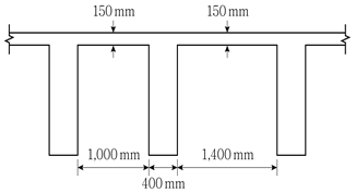 그림과 같이 치수가 주어진 슬래브와 보를 일체로 친 T형보의 플랜지 유효폭 b[mm]는? (단, 보의 경간은 12m이다)