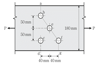 그림과 같은 강구조 인장부재 볼트 연결부의 예상 파단선이 a-b-e-f-g일 때 순폭[mm]은? (단, 볼트구멍의 직경은 22mm이다)