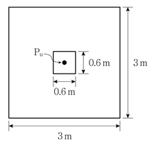 그림과 같이 중심축하중이 작용하는 확대기초의 1방향 전단에 대한 위험 단면에서의 전단력의 크기[kN]는? (단, 중심축하중의 크기 Pu는 2,700kN이고, 기초판의 유효높이 d는 500mm이다)