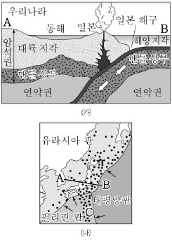 - ① 유라시아 판의 밀도가 태평양 판의 밀도보다 크다.