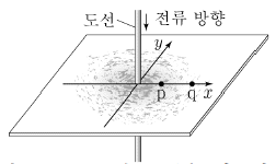 [과목 구분 없음] 그림은 일정한 세기의 전류가 xy평면에 수직 아래로 흐를 때, 전류가 만드는 자기장에 의해 도선 주변의 철가루들이 동심원을 그리며 배열된 모습을 나타낸 것이다. 이에 대한 설명으로 옳은 것은? (단, 점 p와 q는 x축 상에 있으며, 지구 자기장은 고려하지 않는다.)