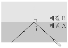 [과목 구분 없음] 그림은 빛이 매질 A, B의 경계면에 입사각 i로 입사하여 전반사하는 모습을 나타낸 것이다. 이에 대한 설명으로 옳은 것은?