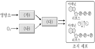그림은 세포 호흡에 필요한 물질이 공급되는 과정과 조직세포에서 일어나는 ATP의 합성과 분해를 나타낸 것이다. (가)~(다)는 각각 호흡계, 순환계, 소화계 중 하나이다. 이에 대한 설명으로 옳은 것은?