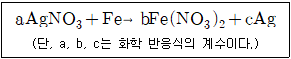 다음은 질산 은(AgNO3) 수용액에 철(Fe)판을 넣었을 때의 화학 반응식이다. 반응 후에 철판에는 은이 석출되었다. 이에 대한 설명으로 옳지 않은 것은? (단, 원자량은 Ag이 Fe보다 크다.)