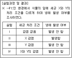 <보기>는 어떤 식물에서 세균 X와 Y가 냉해 발생에 미치는 영향을 알아보기 위한 실험이다. 이 실험에 대한 설명으로 가장 옳은 것은?