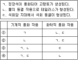 [과목 구분 없음] <보기>의 ㄱ, ㄴ, ㄷ은 여러 가지 풍화 작용의 예를 나타낸 것이다. ㄱ, ㄴ, ㄷ을 기계적 풍화 작용과 화학적 풍화 작용으로 가장 옳게 구분한 것은?