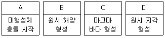 [과목 구분 없음] 그림은 지구의 초기 진화 과정을 순서 없이 나타낸 것이다. A~D를 진화 순서대로 바르게 나열한 것은?