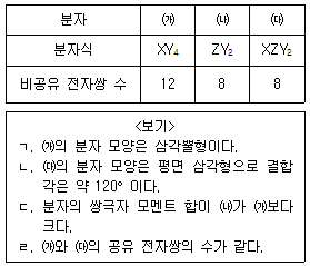 [과목 구분 없음] 표는 2주기 원소 X~Z로 이루어진 분자 ㈎~㈐에 대한 자료이다. ㈎~㈐에서 모든 원자가 옥텟 규칙을 만족할 때, 이에 대한 설명으로 옳은 것만을 <보기>에서 모두 고른 것은? (단, X~Z는 임의의 원소 기호이다.)