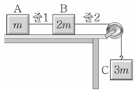 [과목 구분 없음] 그림은 물체 A, B, C에 줄1, 2를 연결하고 C를 잡고 있다가 가만히 놓았을 때 세 물체가 등가속도 직선 운동하는 것을 나타낸 것이다. A, B, C의 질량은 각각 m, 2m, 3m이고, A와 B는 수평한 책상면 위에서 운동한다. 이에 대한 설명으로 가장 옳은 것은? (단, 중력 가속도는 g이고, 줄의 질량 및 모든 마찰과 공기 저항은 무시한다.)