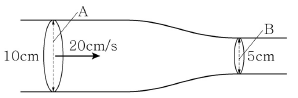[과목 구분 없음] 그림처럼 지름이 10cm에서 5cm로 줄어드는 관이 있다. 지름이 큰 부분인 단면적 A에서 유입되는 유체의 속력이 20cm/s였다면, 줄어든 단면적 B에서 유체의 속력은? (단, 유체는 정상흐름을 하고 있다.)
