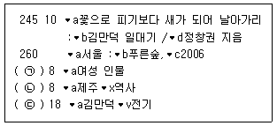 - 650 : 분류기호. 미국소설을 나타내는 분류기호인 650 07이 사용되었다.