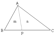 다음 그림에서 △ABC의 면적을 직선 AP로 분할하고자 할 때, BP의 거리는? (단, BC의 거리는 500m이며, m:n=4:6이다)