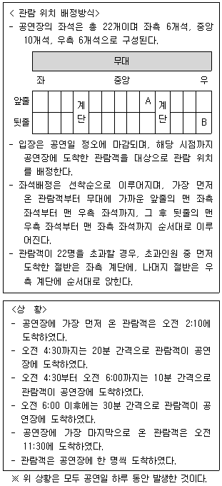 [과목 구분 없음] 다음 <관람 위치 배정방식>과 <상황>을 근거로 판단할 때 옳은 것은?