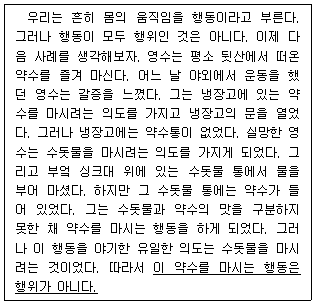 - 행위자가 과거에 가졌던 의도들 중에서 무엇이 실현되었는지에 따라서 행위 여부가 결정된다.