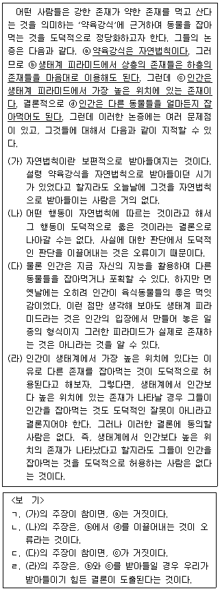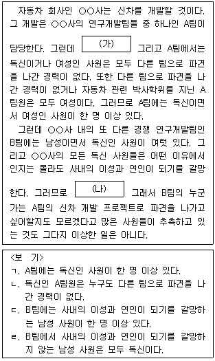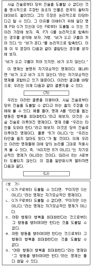 다음 글의 (가)와 (나)에 들어갈 진술을 <보기>에서 골라 알맞게 짝지은 것은?(순서대로 (가), (나))