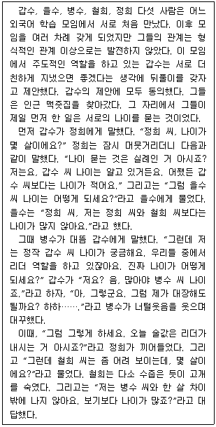 다음 글의 대화 내용이 참일 때, 갑수보다 반드시 나이가 적은 사람만을 모두 고르면?