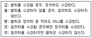 사무관 A는 국가공무원인재개발원에서 수강할 과목을 선택하려 한다. A가 선택할 과목에 대해 갑~무가 다음과 같이 진술하였는데 이 중 한 사람의 진술은 거짓이고 나머지 사람들의 진술은 모두 참인 것으로 밝혀졌다. A가 반드시 수강할 과목만을 모두 고르면?
