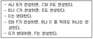 정책 갑에 대하여 A~G는 찬성이나 반대 중 한 의견을 제시하였다. 이들의 찬반 의견이 다음과 같다고 할 때, 반대 의견을 제시한 사람의 최소 인원은?