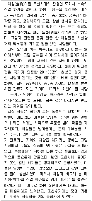 - ① 일반 직업 화가들은 화원 밑에서 막노동에 가까운 일을 담당하였으나 신분은 중인이었다.
