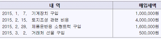 [과목 구분 없음] 다음은 일반과세자 (주)한공이 2015년 제1기 부가기치세 예정신고기간에 발급받은 세금계산서 내역이다. 매입세액 공제액은 얼마인가?