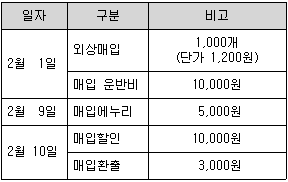 다음은 (주)한공의 2020년 2월 중 상품 취득 관련 자료이다. 2월말 현재 상품의 취득원가는 얼마인가?