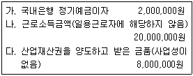 [과목 구분 없음] 다음 자료를 이용하여 거주자 김한공 씨의 2020년도 귀속 종합소득금액을 계산하면 얼마인가? (단, 모든 소득은 국내에서 발생한 것으로 세법에 규정된 원천징수는 적법하게 이루어졌으며 실제로 발생한 경비는 확인되지 않는다.)
