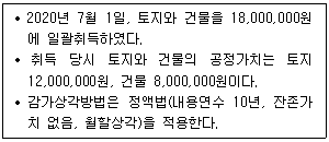 다음은 (주)한공의 2020년 7월 1일 일괄취득한 토지와 건물에 관한 자료이다. 2021년도 기말 재무상태표에 표시될 건물의 장부금액은 얼마인가?