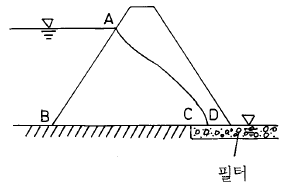다음의 흙댐에서 유선망을 작도하는데 있어 경계조건이 틀린 것은?