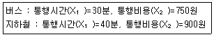 지하철과 버스에 대한 효용함수 및 통행특성 자료가 아래와 같을 때, 로짓모형을 이용한 교통수단별 선택확률이 모두 옳은 것은? (단, 효용함수 V=-0.06(0.5X1+0.002X2))