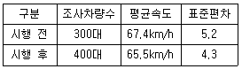 어느 도로의 개선사업을 시행하기 전ㆍ후의 현장관측자료가 아래와 같을 때, 속도 감소효과 여부를 검정한 결과로 옳은 것은? (단, α=0.05)