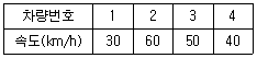 도로의 한 지점에서 관측한 개별 차량 4대의 순간속도가 아래와 같을 때, 공간평균속도는 얼마인가?