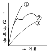 연강, 동, 니켈강의 응력-연율선도에서 번호와 맞게 짝지어진 것은?
