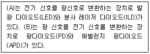 광통신 시스템의 구성 요소에 대한 다음 설명의 (A)와 (B)에 들어갈 알맞은 용어는 무엇인가?